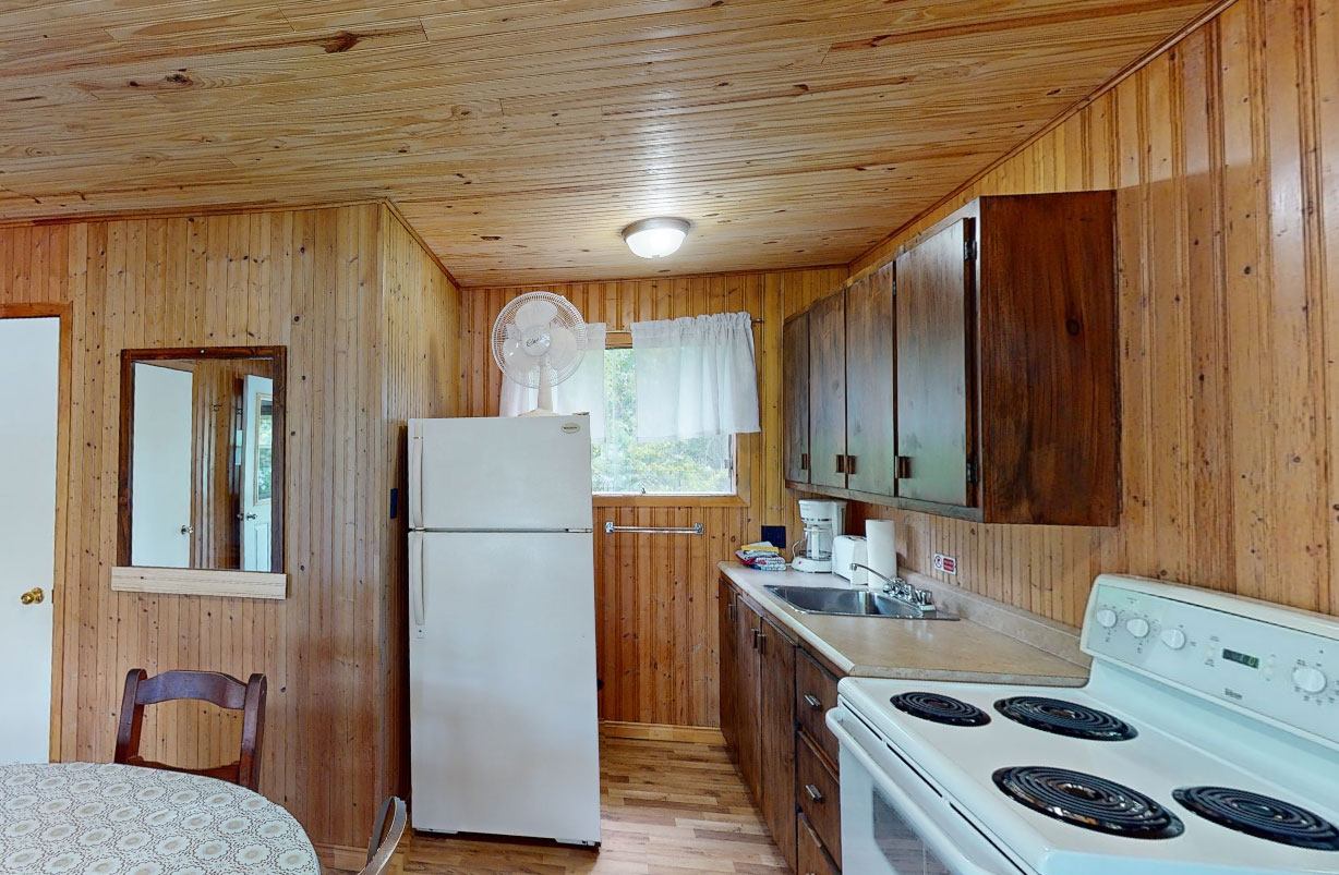 Cottage number 5 is designed for a maximum of four people. It features two bedrooms; one includes two ¾ beds, while the other offers one ¾ bed and two single beds. The fully equipped electric kitchen includes a refrigerator, stove, microwave, toaster, drip coffee maker, dishes, cookware, and all necessary utensils. The bathroom is equipped, of course, with a shower. This cottage is located in a cozy, private little bay.